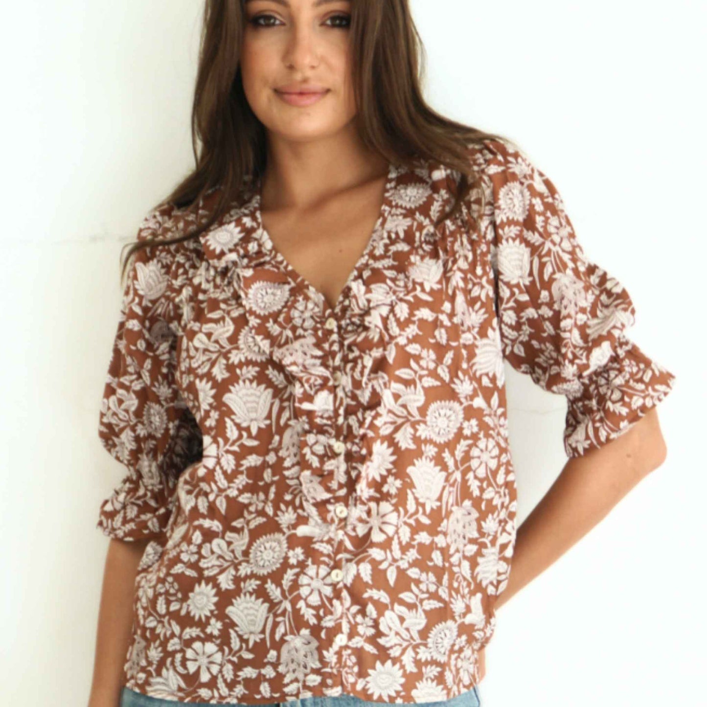 - Soft sustainable cotton with brown and white floral print