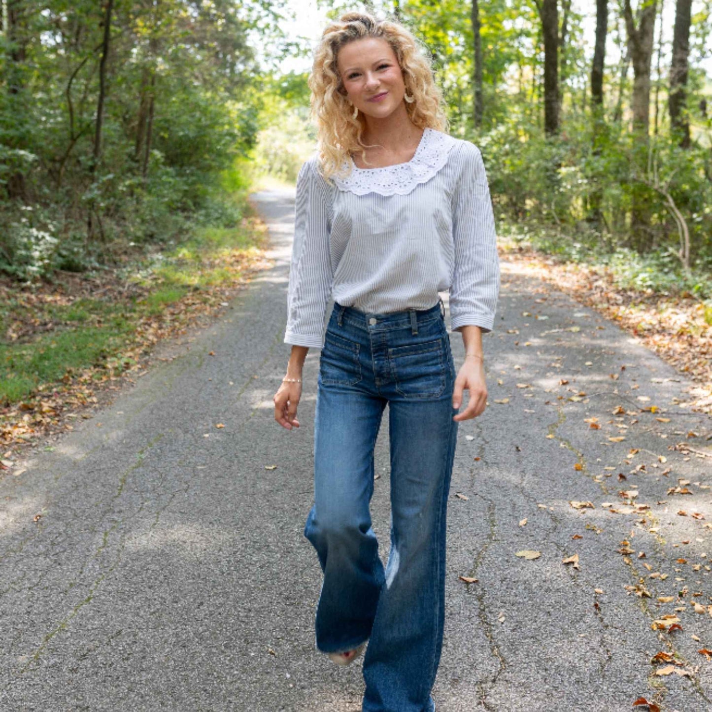 - Eyelet collar and gentle puffed sleeves add feminine details